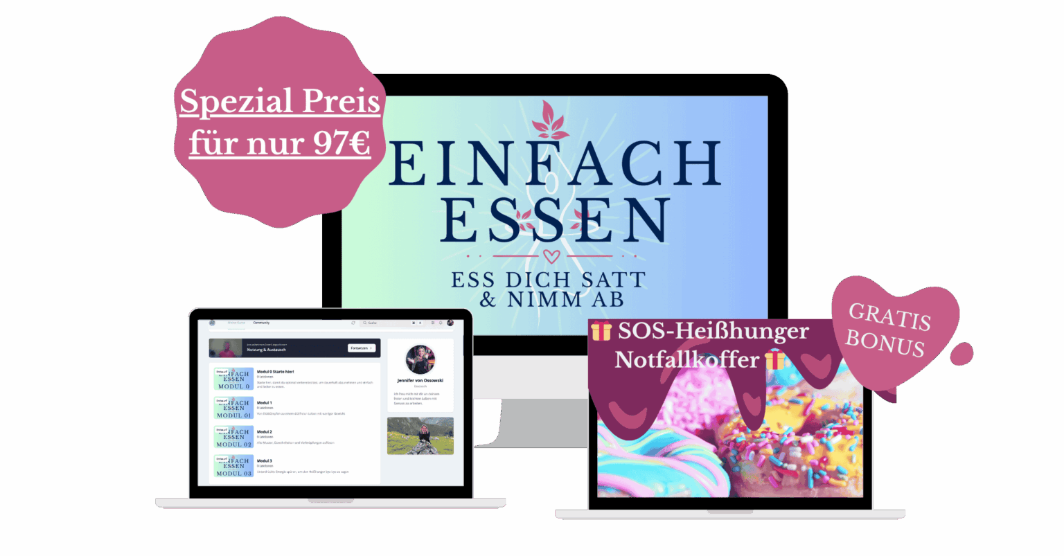 „Einfach essen“ ist dein 4-Wochen-Onlinekurs mit 8 Wochen Zugang – inkl. liebevoller Community und klarer Begleitung.